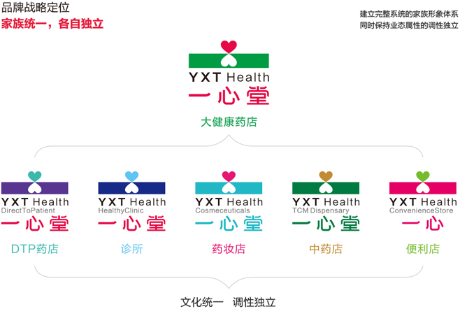 一心堂未來是要構建多業(yè)態(tài)大健康產(chǎn)業(yè)鏈的,集團旗下會有很多業(yè)態(tài),那么怎么才能先通過品牌外在形象實現(xiàn)一開始定下的“家族統(tǒng)一,業(yè)態(tài)獨立”的品牌戰(zhàn)略定位呢?