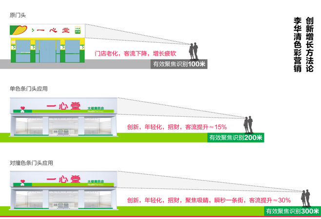 經(jīng)過我們李華清研究小組的測算分析,如果一心堂原來的門頭只能讓人在百米開外看到,那么加了色條的門頭就能夠在200米內(nèi)引導人們的視線;而將綠色條下再襯以高反差的紅色,就能夠在300米內(nèi)視線聚焦。讓整條街道都能看到一心堂,實現(xiàn)焦點引流。