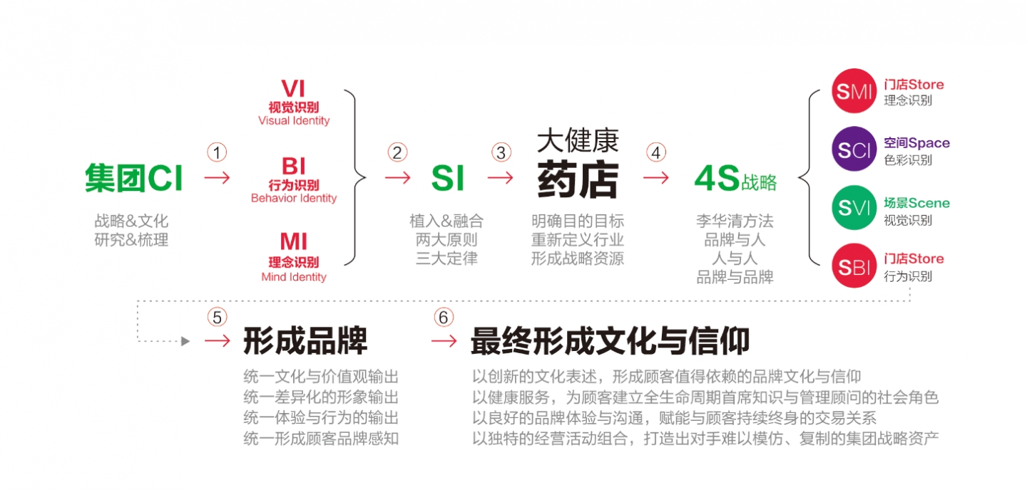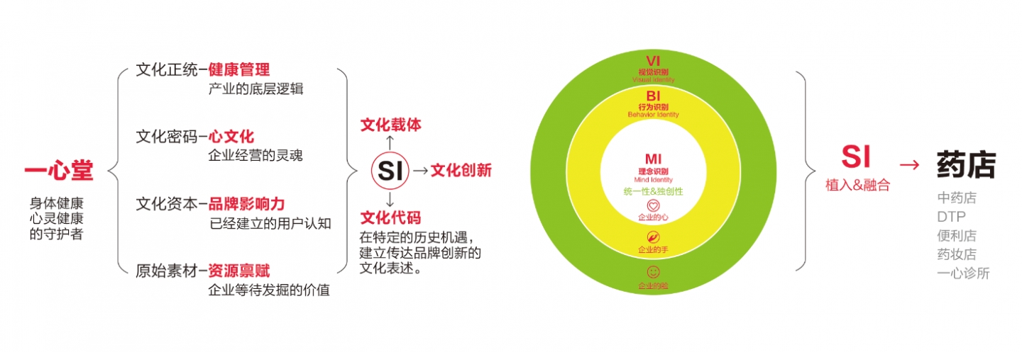 為此,我們依據(jù)品牌感知層和體驗層為原則,在一心堂集團CI基礎(chǔ)上分化出獨立的藥店4S戰(zhàn)略體系,4S戰(zhàn)略完全區(qū)隔于藥店傳統(tǒng)的SI空間設計體系,而是涵蓋了藥店的文化、品牌、體驗、營銷四大維度的整合戰(zhàn)略策劃。