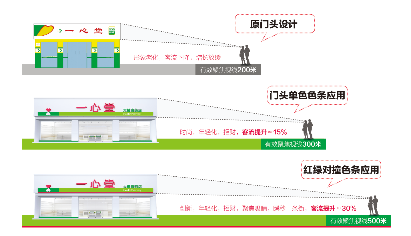 法國色彩大師郎克羅說:“完善的色彩計劃可以讓產(chǎn)品(服務)在不增加成本的情況下,提高其15-30%產(chǎn)品(服務)價值或利潤,這就是色彩的力量。” 在門頭設計開發(fā)的時候,我們利用色彩的視覺牽引特性和二級門頭立體發(fā)光效果,并打破了標志與名字齊平的傳統(tǒng)組合方式,將LOGO應用在下方,與淺綠色條共同起到承載和視覺牽引效果,形成一心堂門店全新的品牌資產(chǎn)。二級門頭的“紅,綠色條對撞”是一心堂門頭殺手級的色彩應用策略,因為在所有光波中紅色光的波長最長,而綠色的可視函數(shù)最高,也更容易聚光,這就是激光筆為多用綠光的原因,當這兩個補色并列時,會引起強烈對比的色覺,會感到紅的更紅、綠的更綠。從而就能快速實現(xiàn)百米聚焦,瞬秒一條街,為藥店引流、招財、增量。